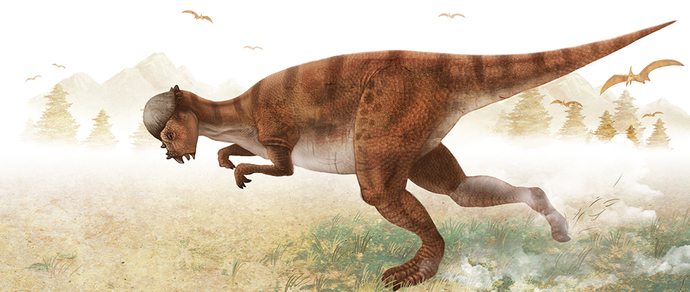 懷俄明腫頭龍?jiān)谄淠X袋上有一個(gè)大大的厚頭蓋骨,出奇地腫厚,形似圓屋頂,頭骨的高度可達(dá)25厘米,而且突出部分是實(shí)心的??茖W(xué)家沒(méi)有確定此圓屋頂是否用于用頭撞(人),或是否有什么撞擊能傷害到恐龍。
