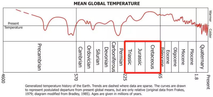 但很遺憾,恐龍所生活的三疊紀(jì)、侏羅紀(jì)、白堊紀(jì)三個(gè)地質(zhì)時(shí)期幾乎是地球溫度最高的時(shí)期。