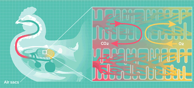 這種結(jié)構(gòu)可以讓肺部實(shí)現(xiàn)無論吸氣還是呼氣都能攝取氧氣,稱為“雙重呼吸”,其效率是哺乳動(dòng)物的2.5倍。