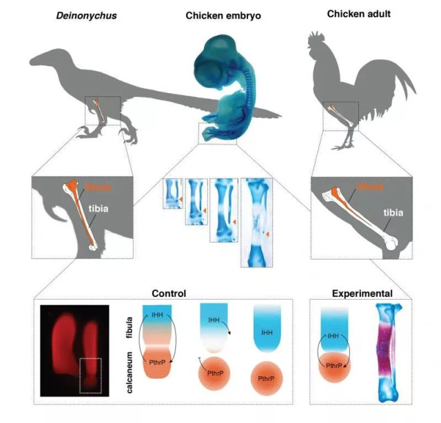 恐龍的腓骨(fibula,橙色部分)會延長至膝關節(jié)踝處,而雞的腓骨則比恐龍的小得多,經過改造雞的胚胎中也顯現(xiàn)了腓骨的邊長