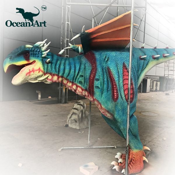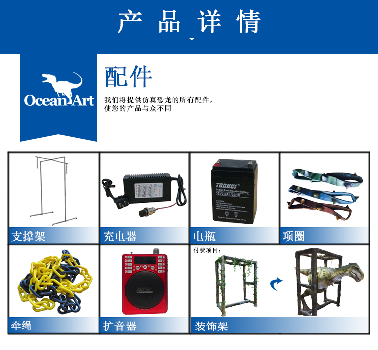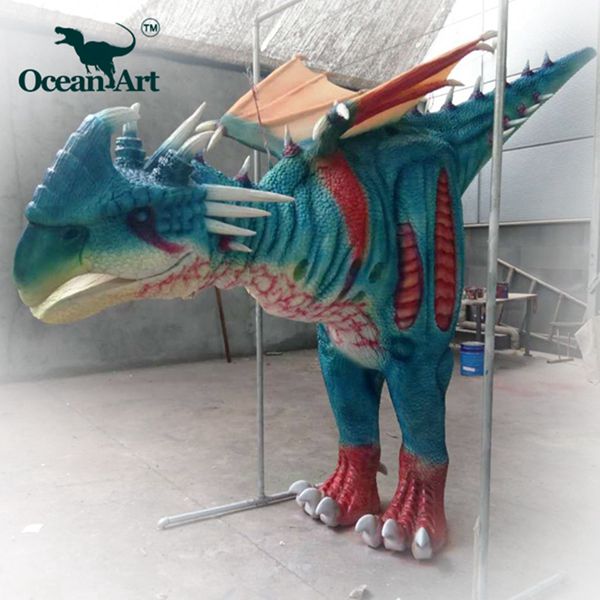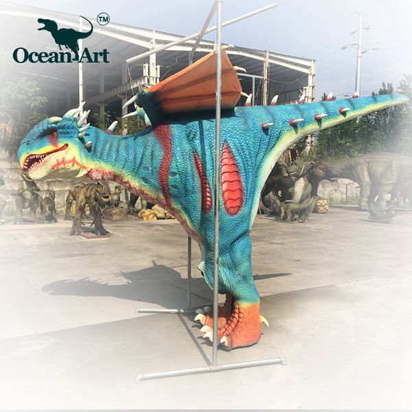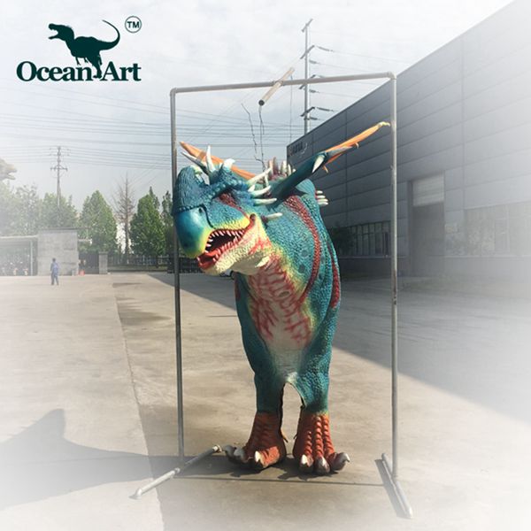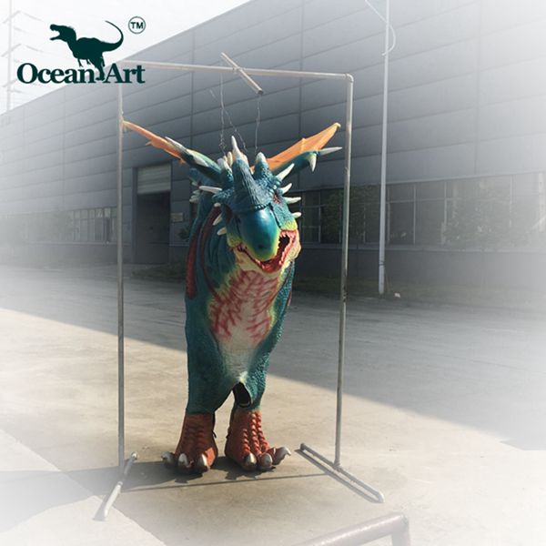 1.人控恐龍分為藏腿或露腿兩種設(shè)計,服裝長約4米,重20千克。藏腿恐龍服在腿和腹部處有一條拉鏈,當(dāng)操作者穿好后,拉上拉鏈便可完全遮住身影;露腿恐龍服則會把操作者雙腿露在外面。尾部有一條可抽出的長桿,便于裝箱運輸。另外,我們會提供一個支撐架,方便擺放恐龍服裝。