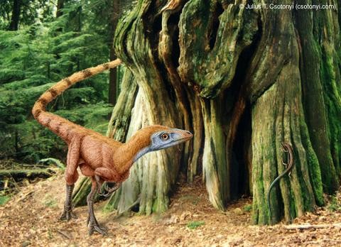 這只世界上所發(fā)現(xiàn)的第一只長有絨狀細毛的恐龍,被命名為原始中華龍鳥,是一種介于恐龍與鳥類之間的過渡型生物,可能代表了鳥類起源和演化的祖先類型。它擁有一個大頭顱,樣子與雞相近,前肢短小,后肢長而粗壯;嘴里的銳利牙齒,說明它是一只活躍的掠食者。除了長毛以外,它那條由多達58節(jié)尾椎骨所組成的特長尾巴,也是一個重要的特征。它生活在中國的白堊紀早期,以蜥蜴為生。