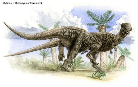4. 野牛龍(愛氏角龍)野牛龍生活在白堊紀晚期,大約6米長、1米高,頭部有三只大角,脖子上有一個大頸盾,邊緣有齒狀骨質(zhì)突起。它是由山普森(Sampson)在1994年發(fā)現(xiàn)的三個頭骨化石命名的。像其它角龍一樣,它在獸群中穿行,有牙齒,能咀嚼最硬的植物.